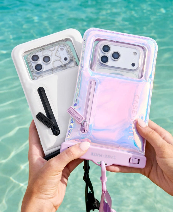 your favorite waterproof floating pouch now available in a sparkly, wavy style with a hidden pocket inside for extra storage.