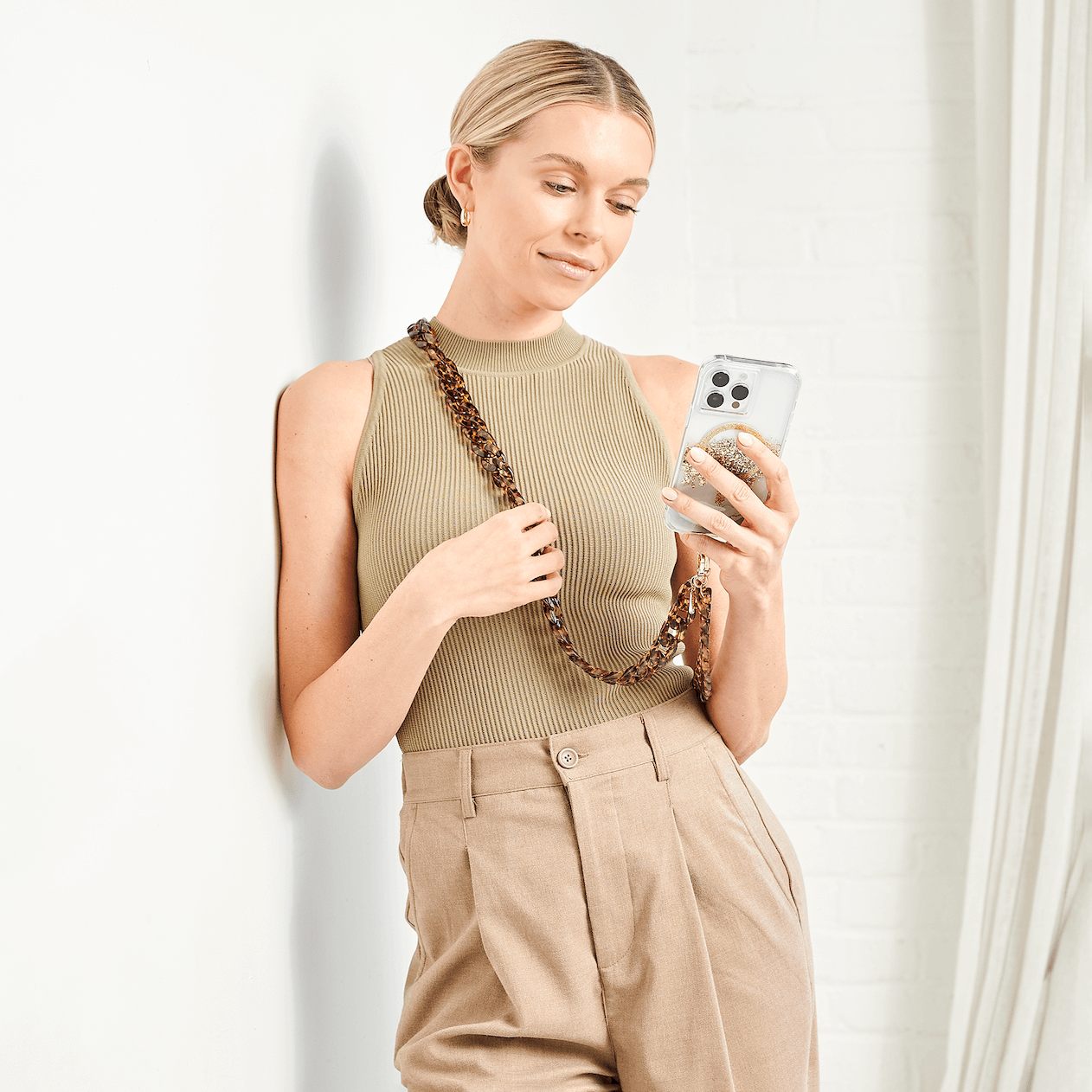 No bags needed— the Phone Crossbody elevates your on-the-go style without the extra baggage. Let the Phone Crossbody’s strong chain carry the full weight of your phone so you can go hands-free for a night on the town or running errands! This Phone Crossbody is designed to fit with all phone cases and allows you to charge your phone without removing it. Choose your favorite style and reimagine how you carry your phone when on the go!