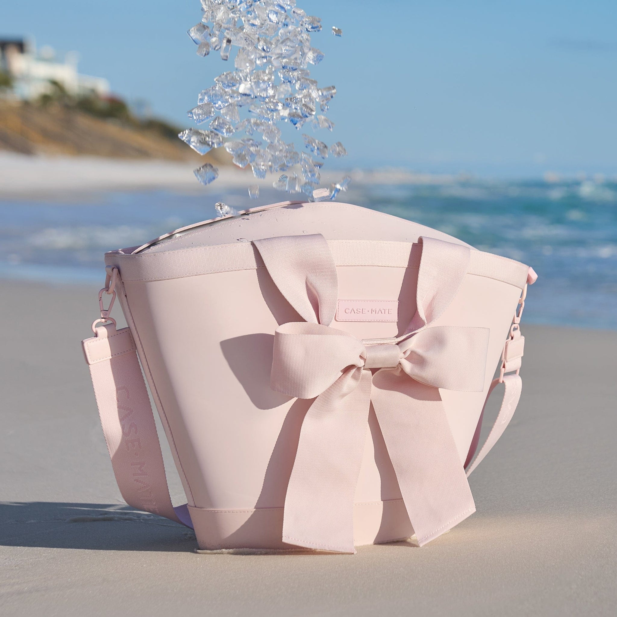 bottom of cooler with "case-mate" branding imprinted into the sand from the base of the cooler bag leaving a mark #color_ballet pink bow